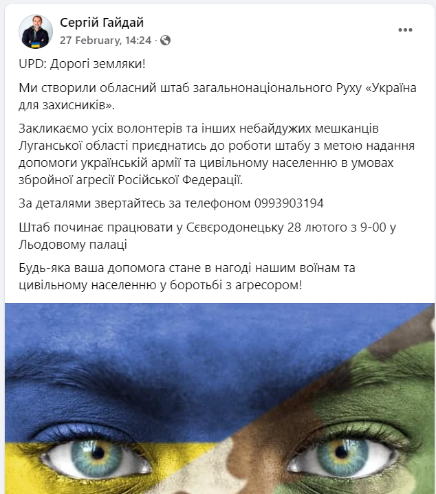 Створили обласний штаб загальнонаціонального Руху «Україна для захисників». Закликаємо усіх волонтерів та інших небайдужих мешканців Луганської області приєднатись до роботи штабу з метою надання допомоги українській армії та цивільному населенню в умовах збройної агресії Російської Федерації. За деталями звертайтесь за телефоном 0993903194. Штаб починає працювати у Сєвєродонецьку 28 лютого з 9-00 у Льодовому палаці. Будь-яка ваша допомога стане в нагоді нашим воїнам та цивільному населенню у боротьбі з агресором!